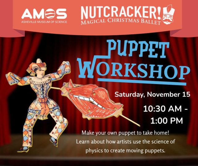 Join AMOS Educators, in partnership with the upcoming performance of ‘Nutcracker! Magical Christmas Story, for a puppet making workshop on Saturday, November 15th. Learn about how artists used Newton’s Laws of Motion to bring art to life through the magic of puppetry. Activity is free with admission.